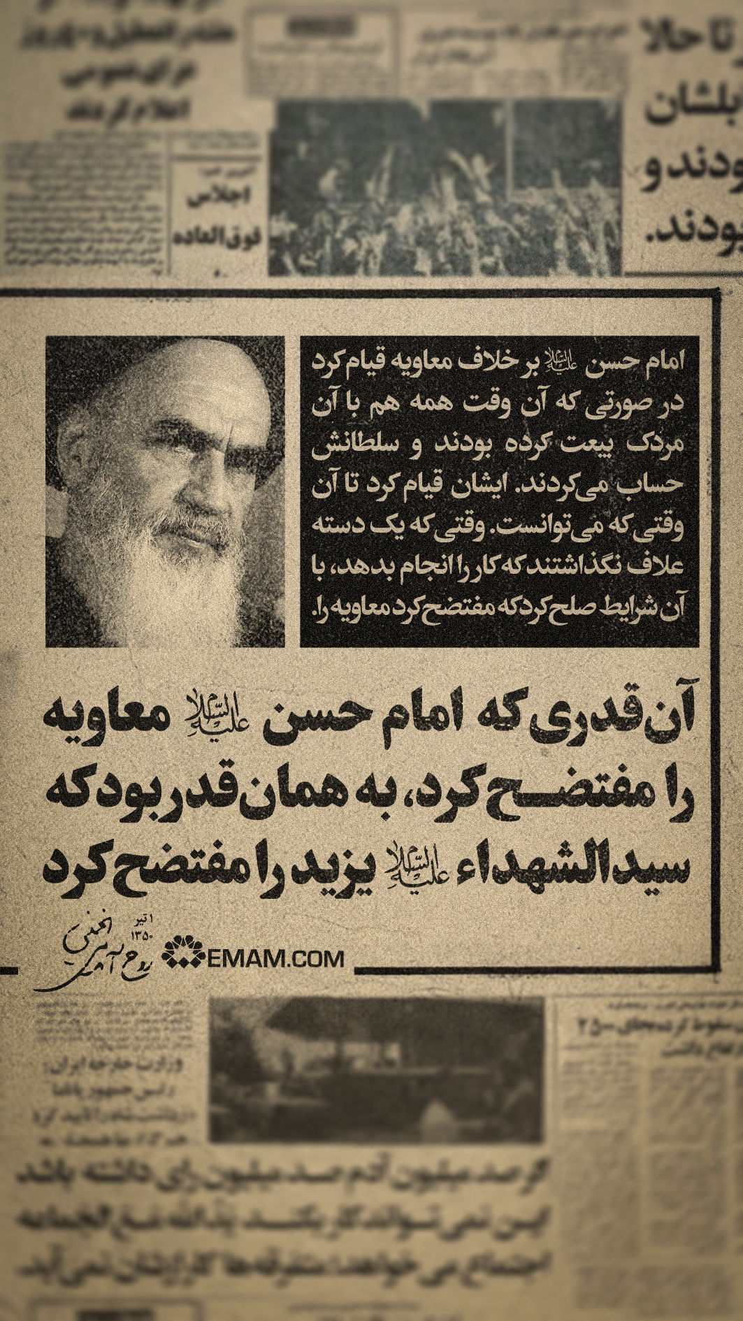 حضرت امام حسن (علیهالسلام) بر خلاف معاویه قیام کرد در صورتی که آن وقت همه هم با آن مردک بیعت کرده بودند و سلطانش حساب میکردند. حضرت امام حسن (علیهالسلام) قیام کرد تا آن وقتی که میتوانست. وقتی که یک دسته علاف نگذاشتند که کار را انجام بدهد، با آن شرایط صلح کرد که مفتضح کرد معاویه را. آن قدری که حضرت امام حسن (علیهالسلام) معاویه را مفتضح کرد به همان قدر بود که سید الشهداء (علیهالسلام) یزید را مفتضح کرد. 01 تیر 1350