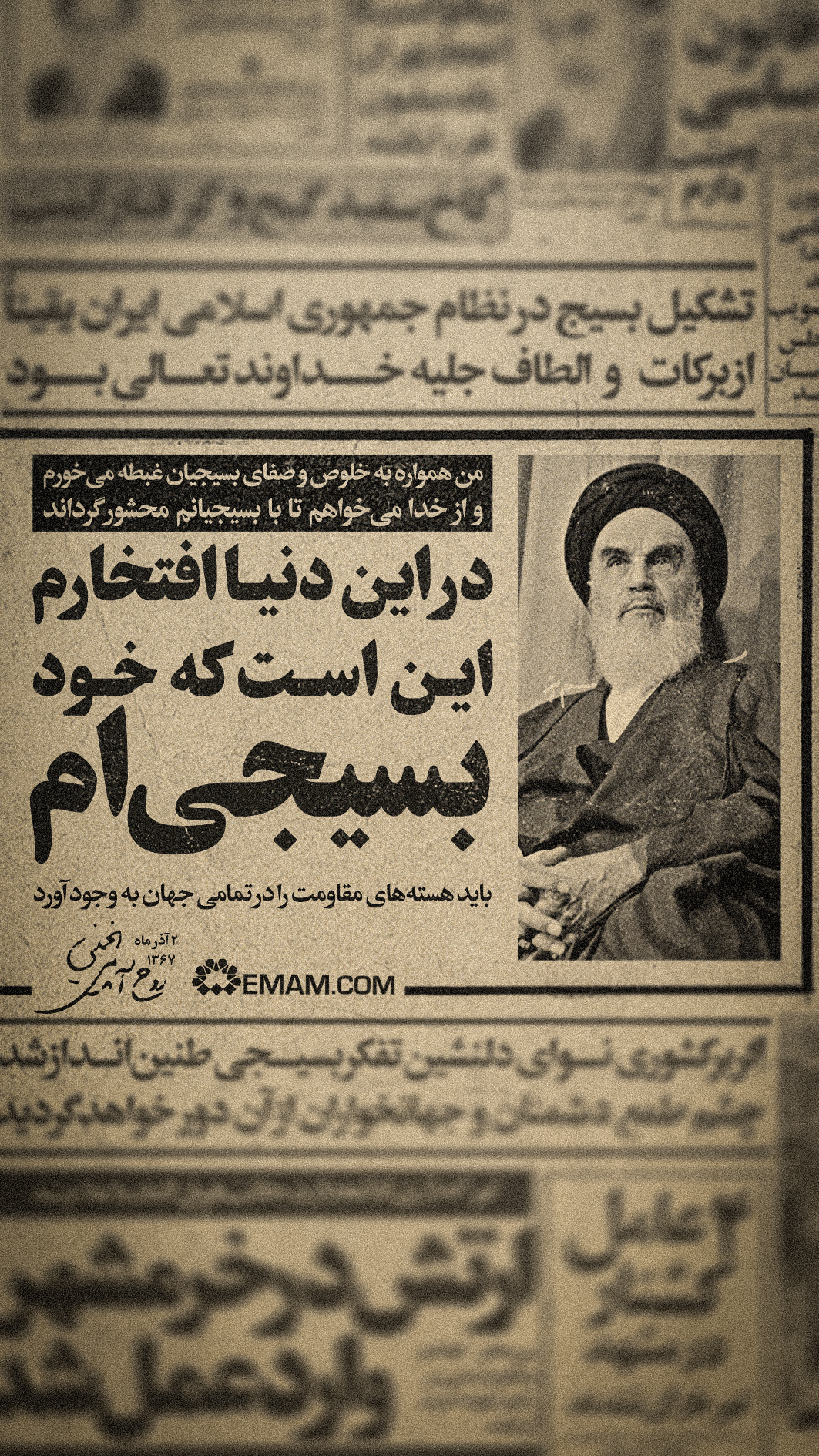I always envy the sincerity and purity of the basijis and pray to God to enlist me among the basijiis. In this world, my honor is to be a basij... the nuclei of resistance should brought into being in the entire world. November ۲۳, ۱۹۸۸