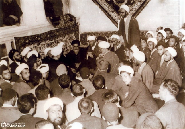 پس از آزادی امام خمینی از زندان رژیم پهلوی در 16 فروردین 1343،محافل دیدار و جشن به این مناسبت در قم برگزار شد. این عکس، یکی از این محافل را نشان میدهد.