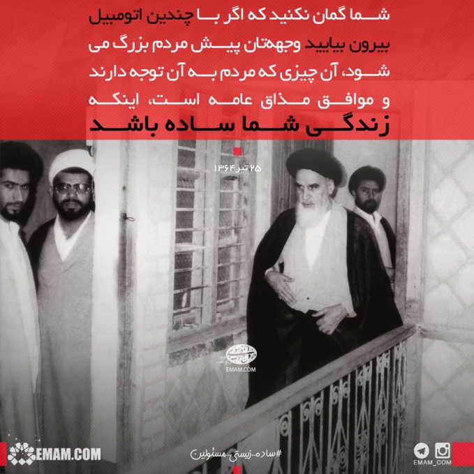 فلا تتصوروا انکم عند ما تاتون مصحوبین بعددٍ من السیارات تزداد منزلتکم عند الناس، إن ما یجلب انتباه عامه الناس ویوافق امزجتهم واذواقهم هو بساطه عیشکم کما کان زعماء الإسلام والنبیّ وامیر المومنین وائمتنا یعیشون عیشه بسیطه وعادیه بل دون العادیه. ۲۷ شوال ۱۴۰۵