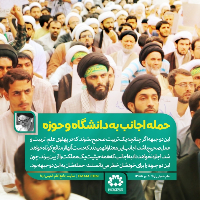 این دو جبهه اگر چنانچه یک تربیت صحیح بشوند که در پهلوی علم، تربیت و عمل صحیح باشد، اجانب این معنا را فهمیدند که دست آنها از منافع کوتاه خواهد شد. اجازه نخواهد داد به اجانب که همه حیثیت یک مملکت را از بین ببرند. چون این دو جبهه را برای خودشان خطر میدانستند، حملهشان به این دو جبهه بود. ۶ تیر ۱۳۵۸