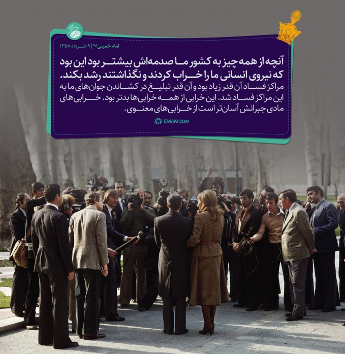 آنچه از همه چیز به کشور ما صدمهاش بیشتر بود این بود که نیروی انسانی ما را خراب کردند و نگذاشتند رشد بکند. مراکز فساد آن قدر زیاد بود و آن قدر تبلیغ در کشاندن جوانهای ما به این مراکز فساد شد. این خرابی از همه خرابیها بدتر بود. خرابیهای مادی جبرانش آسانتر است از خرابیهای معنوی. ۹ خرداد ۱۳۵۸
