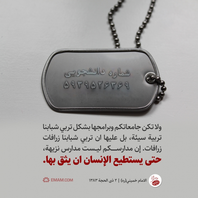 ولا تکن جامعاتکم وبرامجها بشکل تربی شبابنا تربیه سیئه، بل علیها ان تربی شبابنا زرافات زرافات. إن مدارسکم لیست مدارس نزیهه، حتی یستطیع الإنسان ان یثق بها. ۲ ذی الحجه ۱۳۸۳