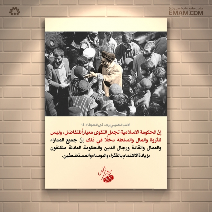 إنّ الحكومة الاسلامية تجعل التقوى معياراً للتفاضل، وليس للثروة والمال والسلطة دخلًا في ذلك؛ إنّ جميع المداراء والعمال والقادة ورجال الدين والحكومة العادلة ملكلفون بزيادة الاهتمام بالفقراء والبؤساء والمستضعفين. ۱ ذي الحجة ۱۴۰۷