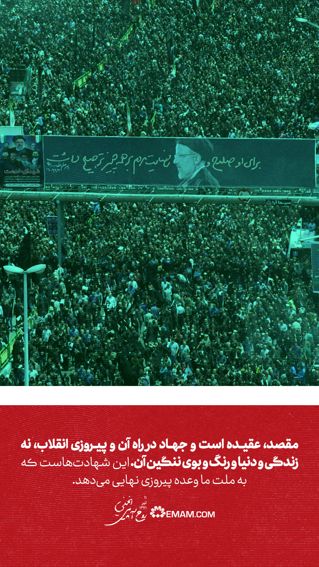 مقصد، عقیده است و جهاد در راه آن و پیروزی انقلاب، نه زندگی و دنیا و رنگ و بوی ننگین آن. این شهادتهاست که به ملت ما وعده پیروزی نهایی میدهد. 11 تیر 1361