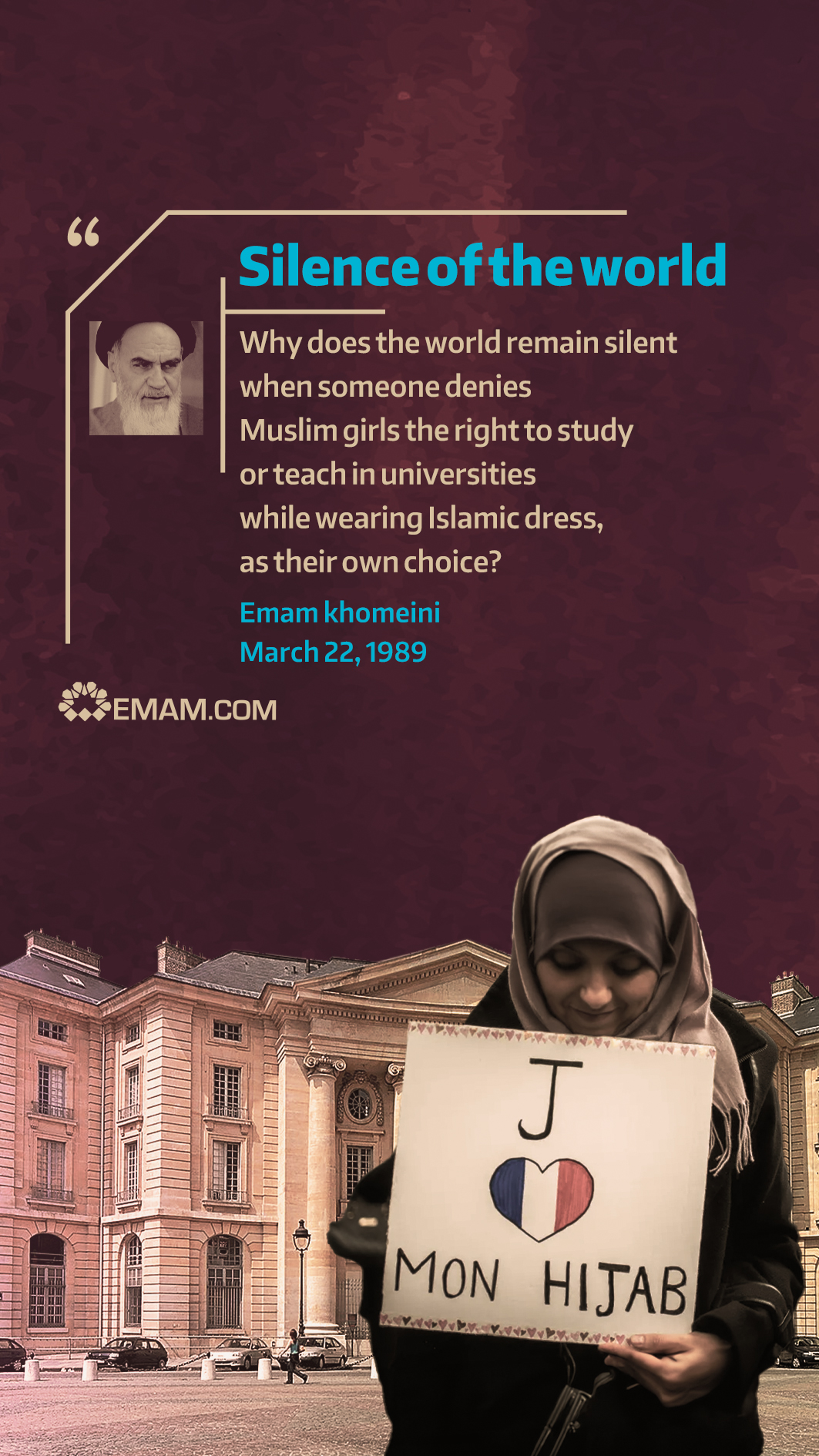 Why does the world remain silent when someone denies Muslim girls the right to study or teach in universities while wearing Islamic dress, as their own choice? March ۲۲, ۱۹۸۹