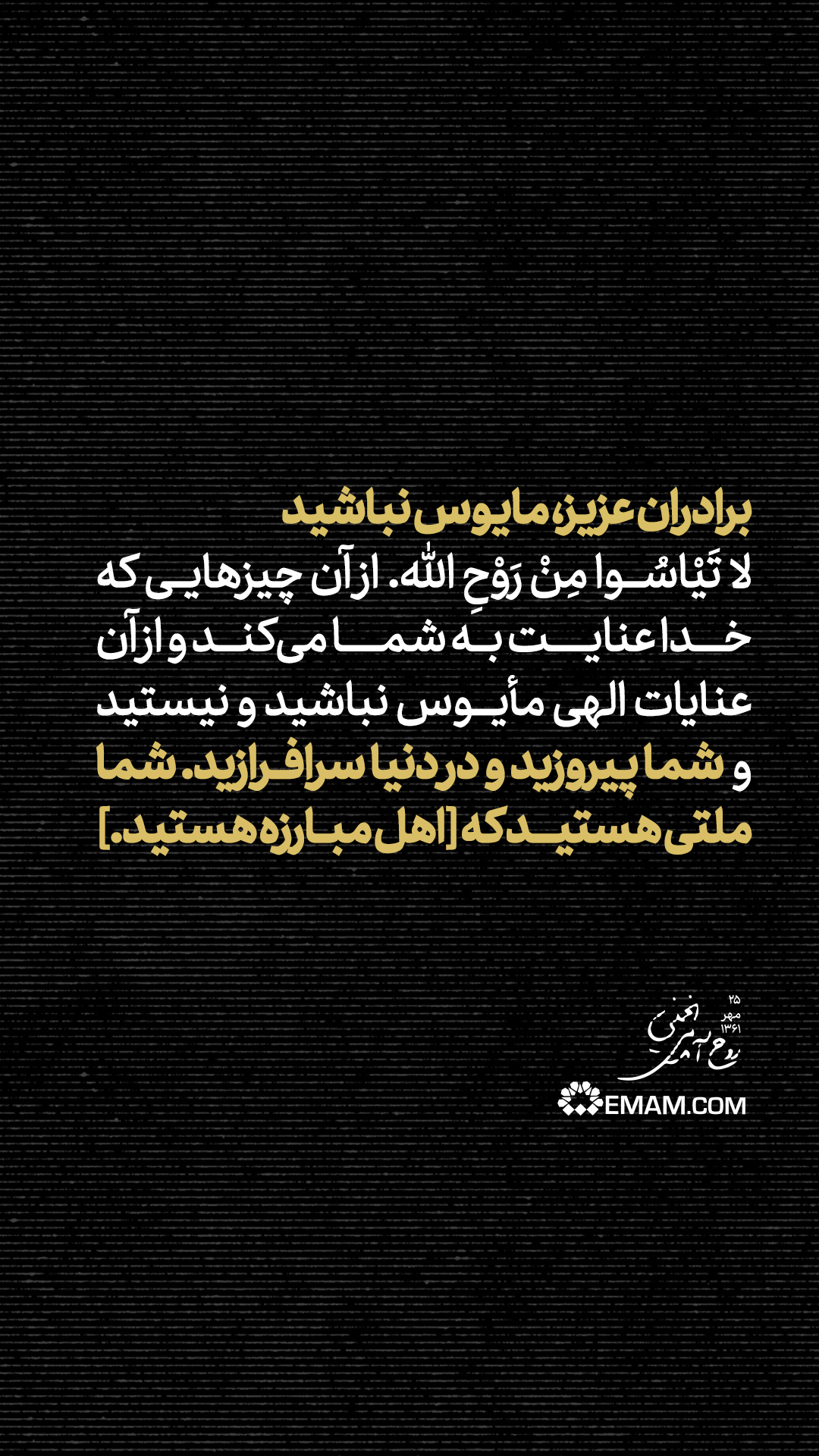 ایها الاخوه الاعزاء لا تیاسوا من روح الله. فانتم المنتصرون ورووسکم مرفوعه فی العالم. إنکم شعب یومن بالنضال. ۲۹ ذی الحجه ۱۴۰۲