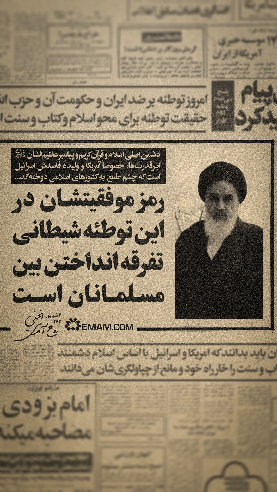 علی المسلمین المشارکین فی المواقف الکریمه من ایه مله ومذهب، ان یعلموا جیداً ان العدو الاصلی للإسلام والقرآن الکریم، والنبیّ العظیم (ص)، هو القوی العظمی خصوصاً امریکا وولیدتها غیر الشرعیه إسرائیل الطامعه بالدول الإسلامیه... وسرّ نجاح هولاء فی موامراتهم الشیطانیه إلقاوهم التفرقه بین المسلمین بای شکل یستطیعون. ۲۸ ذو القعده ۱۴۰۴