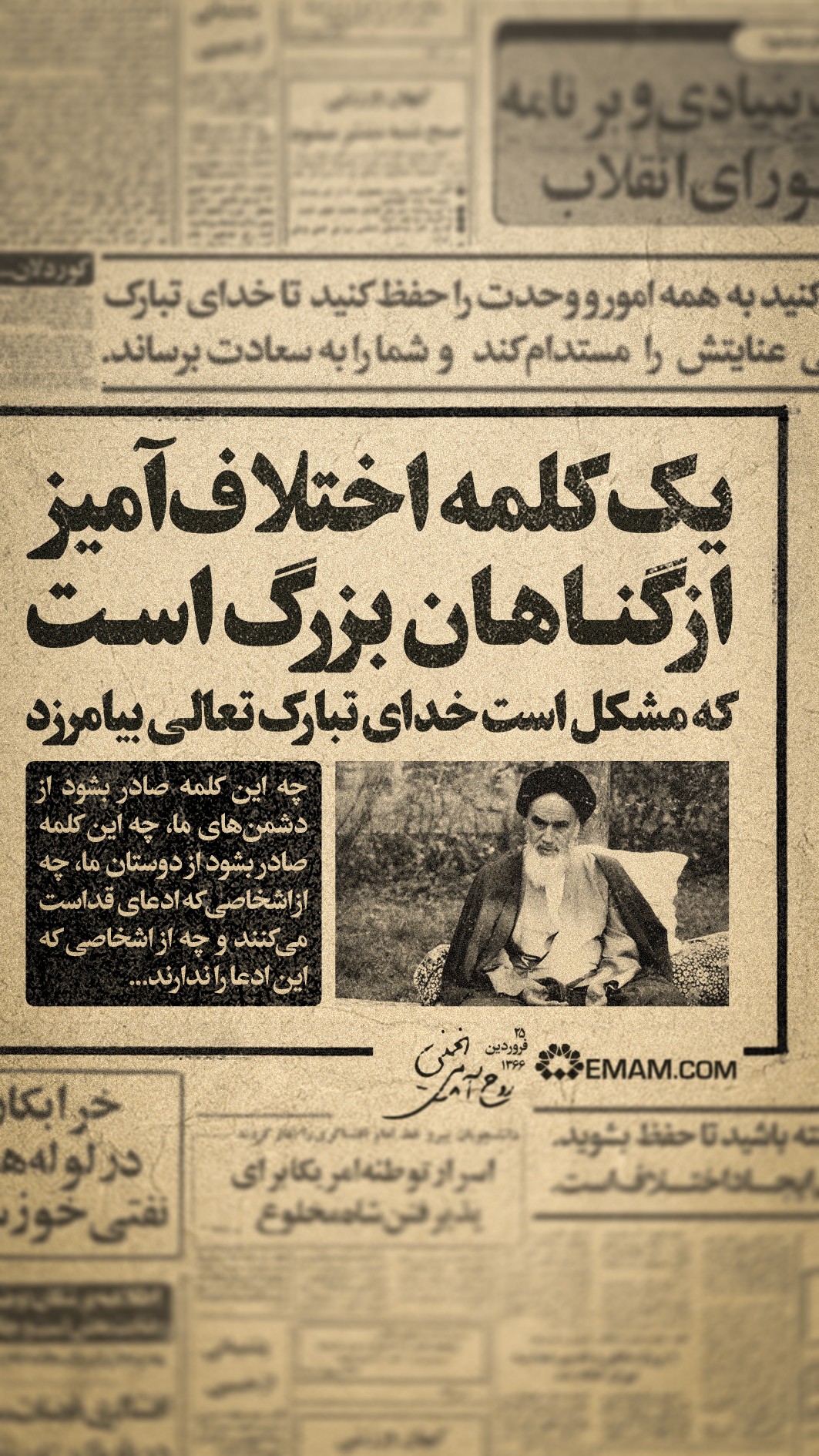 یک کلمه اختلافآمیز از گناهان بزرگی است که مشکل است خدای تبارک تعالی بیامرزد، چه این کلمه صادر بشود از دشمنهای ما، چه این کلمه صادر بشود از دوستان ما، چه از اشخاصی که ادعای قداست میکنند و چه از اشخاصی که این ادعا را ندارند. 25 فروردین 1366