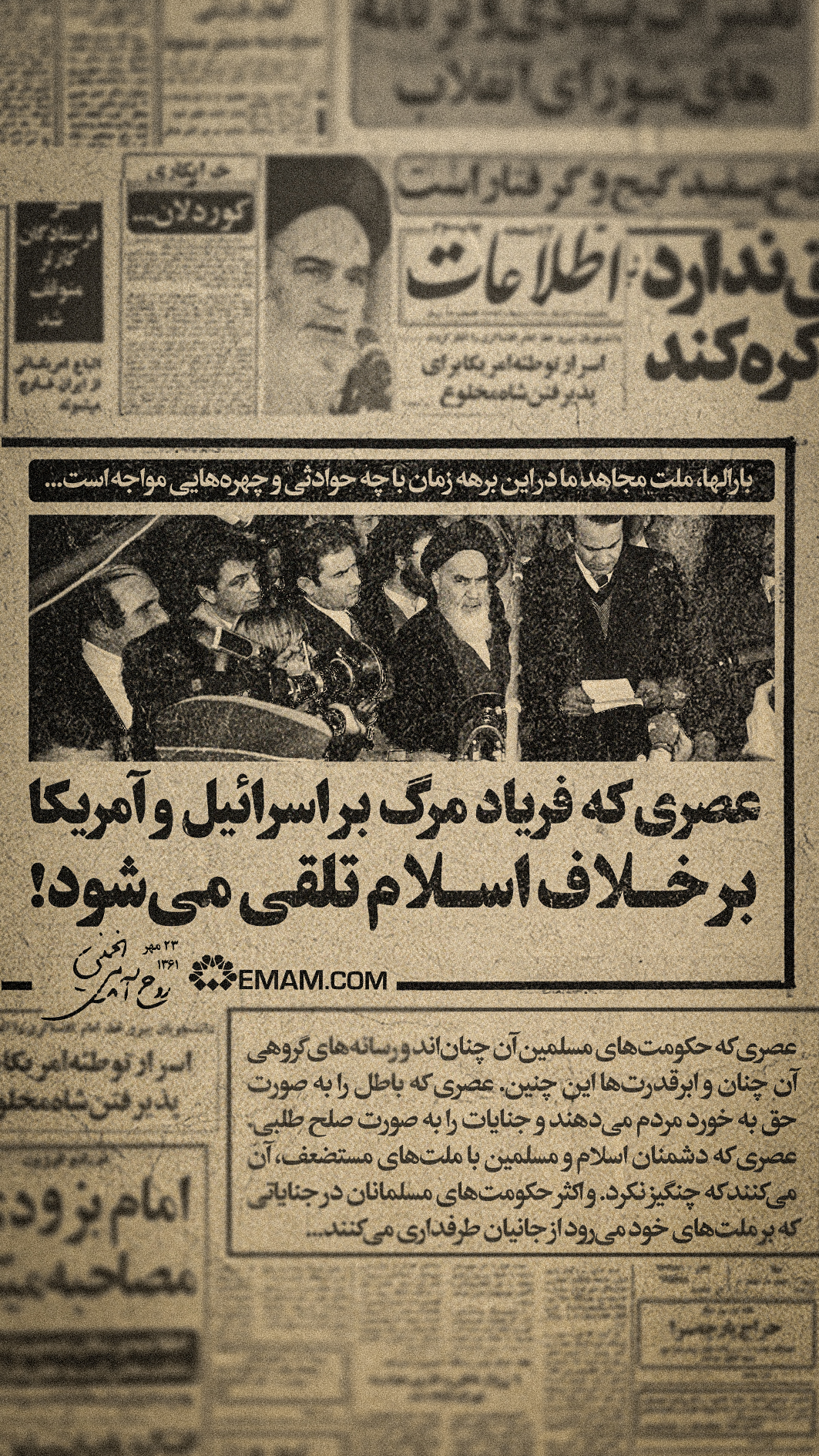 إلهی! ایه احداث وایه وجوه یواجهها شعبنا المجاهد فی هذا العصر؟. عصر حکومات المسلمین فیه بهذا النحو، ووسائل الإعلام بتلک الصوره، والقوی العظمی بهذا الوضع .. عصر یصور الباطل فیه للناس حقاً، والجریمه وسیله للسلام. عصر یمارس فیه اعداء الإسلام والمسلمین مع الشعوب المستضعفه ما لم یمارسه جنکیز، وان معظم حکومات المسلمین تناصر المجرمین فی الجرائم التی ترتکب بحق شعوبهم... عصر یعتبر فیه هتاف الموت لإسرائیل وامیرکا مناهضاً للإسلام. ۲۷ ذی الحجه ۱۴۰۲